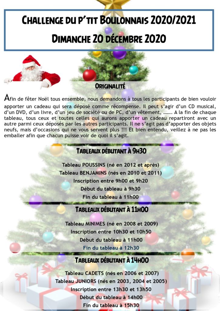 De plus, les entraîneurs ont souhaité offrir la possibilité aux enfants de pouvoir jouer un maximum et ont ainsi programmé l’habituel tournoi du P’tit Boulonnais dimanche prochain (20 décembre). Vous trouverez également ci-dessous les horaires de votre enfant en fonction de sa catégorie d’âge.